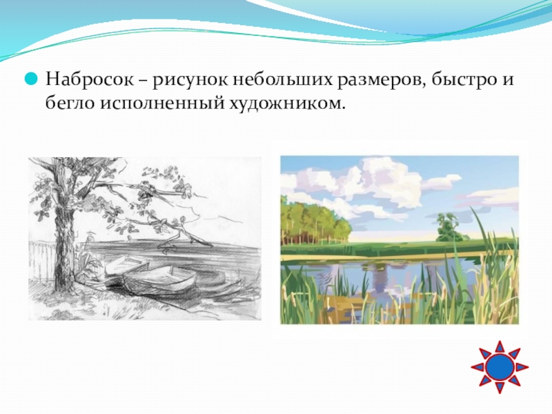 Слайд 60Набросок – рисунок небольших размеров, быстро и бегло исполненный художником.