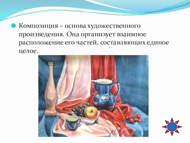 Слайд 6Композиция – основа художественного произведения. Она организует взаимное расположение его частей,