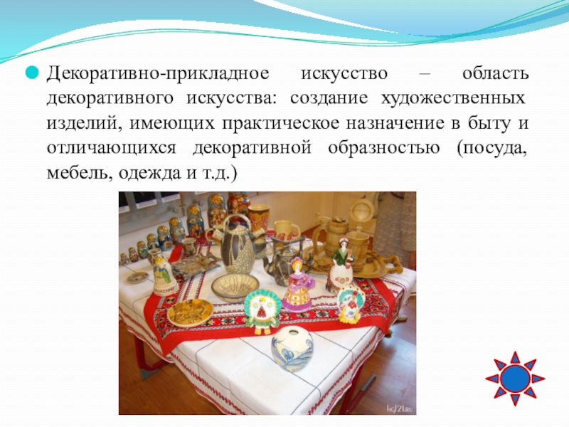 Слайд 10Декоративно-прикладное искусство – область декоративного искусства: создание художественных изделий, имеющих практическое
