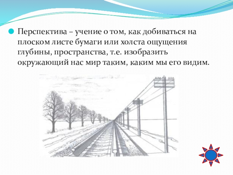 Слайд 39Перспектива – учение о том, как добиваться на плоском листе бумаги