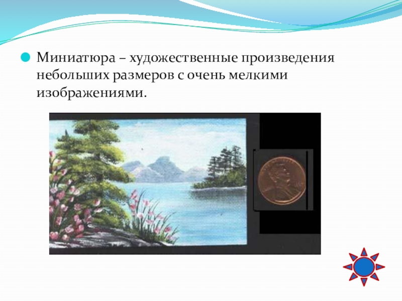 Слайд 40Миниатюра – художественные произведения небольших размеров с очень мелкими изображениями.
