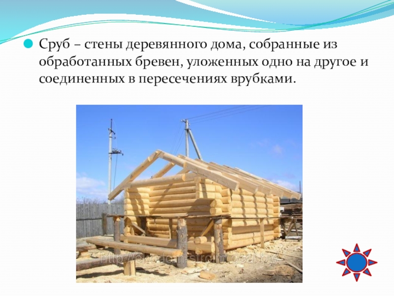 Слайд 49Сруб – стены деревянного дома, собранные из обработанных бревен, уложенных одно