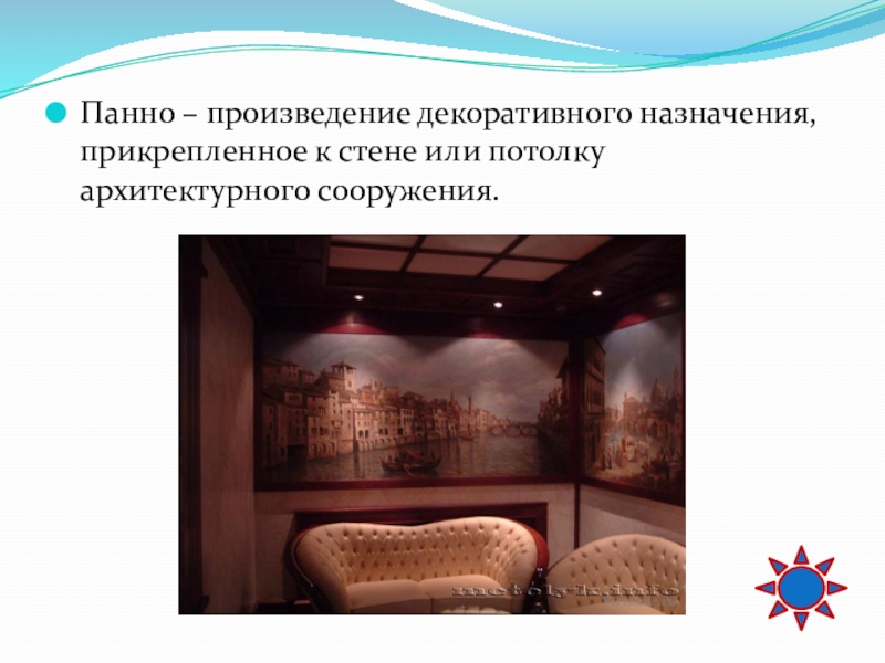 Слайд 63Панно – произведение декоративного назначения, прикрепленное к стене или потолку архитектурного