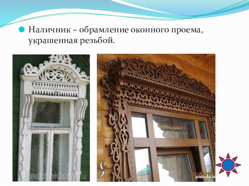 Слайд 51Наличник – обрамление оконного проема, украшенная резьбой.