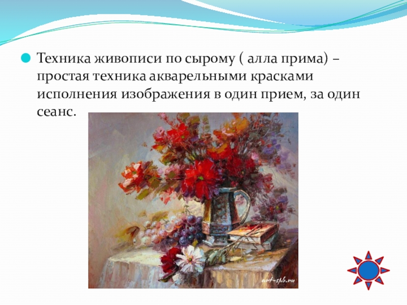 Слайд 54Техника живописи по сырому ( алла прима) – простая техника акварельными