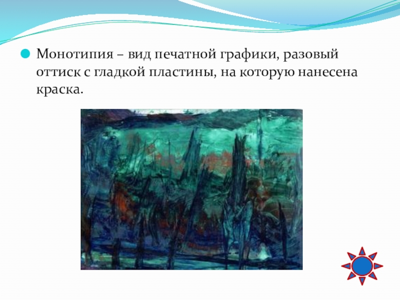Слайд 42Монотипия – вид печатной графики, разовый оттиск с гладкой пластины, на