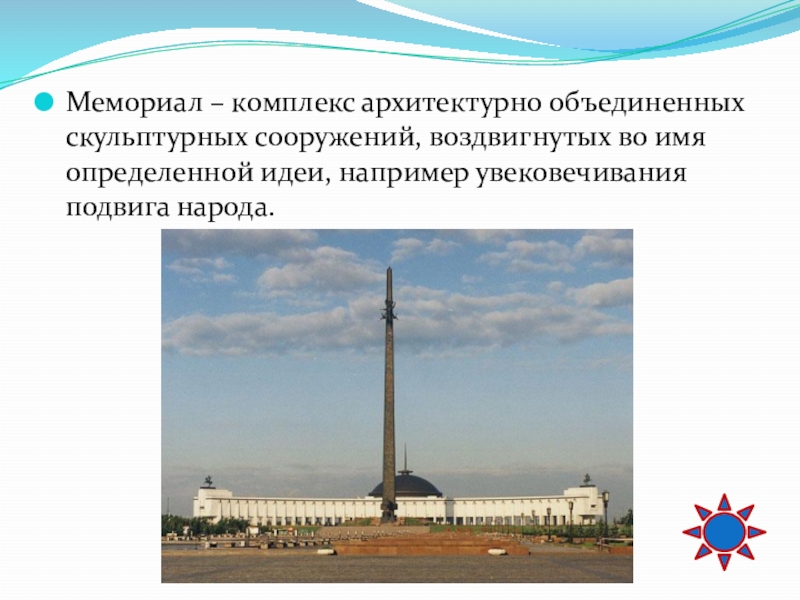 Слайд 75Мемориал – комплекс архитектурно объединенных скульптурных сооружений, воздвигнутых во имя определенной