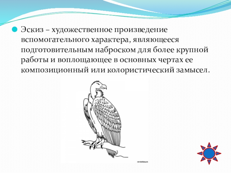 Слайд 67Эскиз – художественное произведение вспомогательного характера, являющееся подготовительным наброском для более
