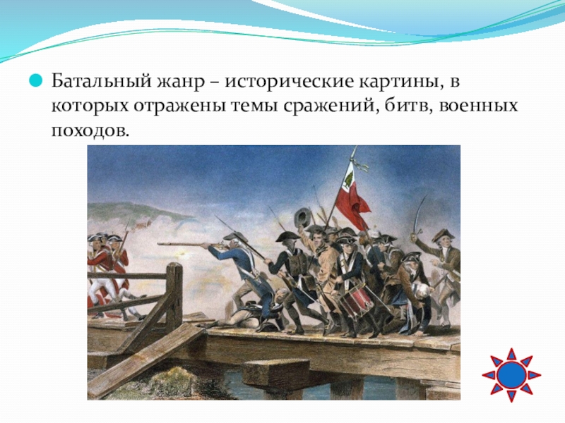 Слайд 71Батальный жанр – исторические картины, в которых отражены темы сражений, битв,