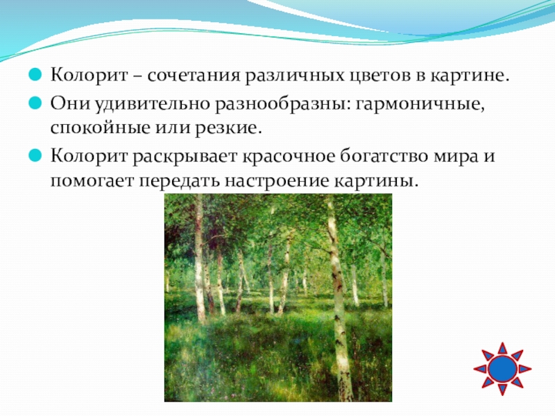 Колорит раскрывает красочное богатство мира и помогает передать настроение картины.