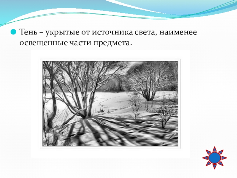 Слайд 47Тень – укрытые от источника света, наименее освещенные части предмета.