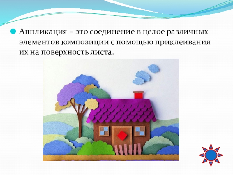 Слайд 7Аппликация – это соединение в целое различных элементов композиции с помощью