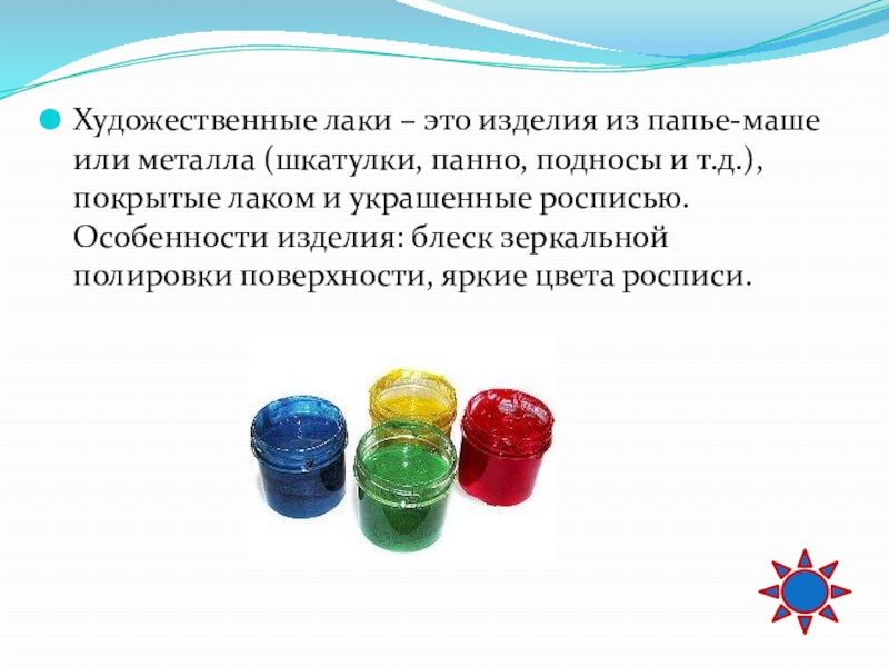 Слайд 44Художественные лаки – это изделия из папье-маше или металла (шкатулки, панно,