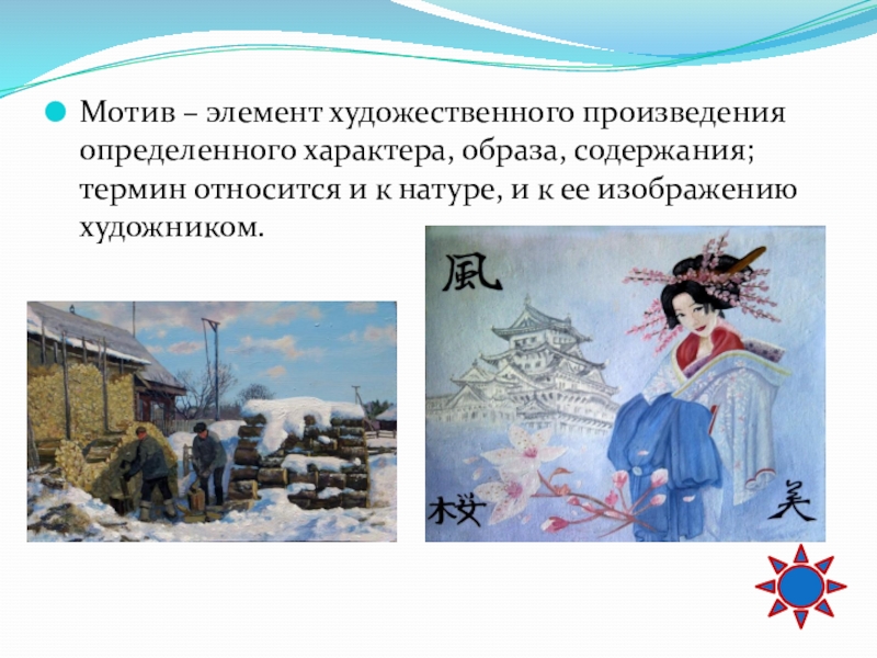 Слайд 62Мотив – элемент художественного произведения определенного характера, образа, содержания; термин относится