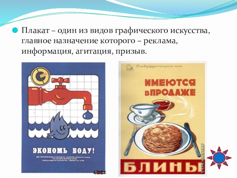 Слайд 73Плакат – один из видов графического искусства, главное назначение которого –