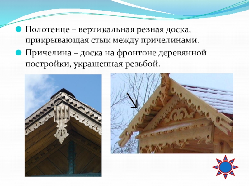 Слайд 50Полотенце – вертикальная резная доска, прикрывающая стык между причелинами.