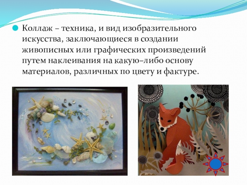 Слайд 74Коллаж – техника, и вид изобразительного искусства, заключающиеся в создании живописных