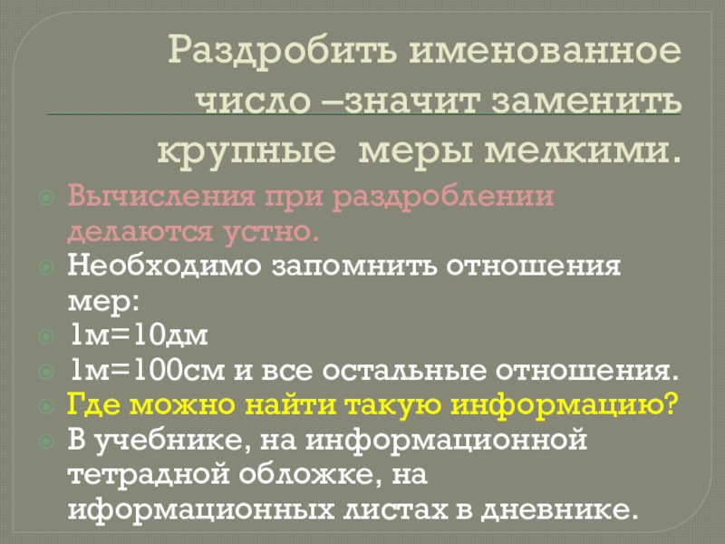 Раздробить именованное число –значит заменить крупные меры мелкими.Вычисления при раздроблении делаются устно.Необходимо запомнить отношения мер:1м=10дм1м=100см и все