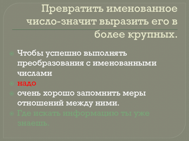 Слайд 4Превратить именованное число-значит выразить его в более крупных.