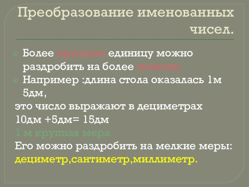 Преобразование именованных чисел.Более крупную единицу можно раздробить на более мелкую.Например :длина стола оказалась 1м 5дм,это число выражают в дециметрах 10дм +5дм= 15дм1 м крупная мера Его можно раздробить на мелкие меры:дециметр,сантиметр,миллиметр.
