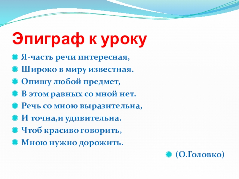 Эпиграф к урокуЯ-часть речи интересная,Широко в миру известная.Опишу любой предмет,В этом равных со мной нет.Речь со мною