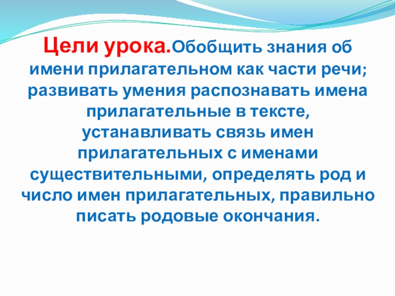 Цели урока.Обобщить знания об имени прилагательном как части речи; развивать умения распознавать имена прилагательные в тексте, устанавливать связь имен прилагательных с именами существительными, определять род и число имен прилагательных, правильно писать родовые окончания.