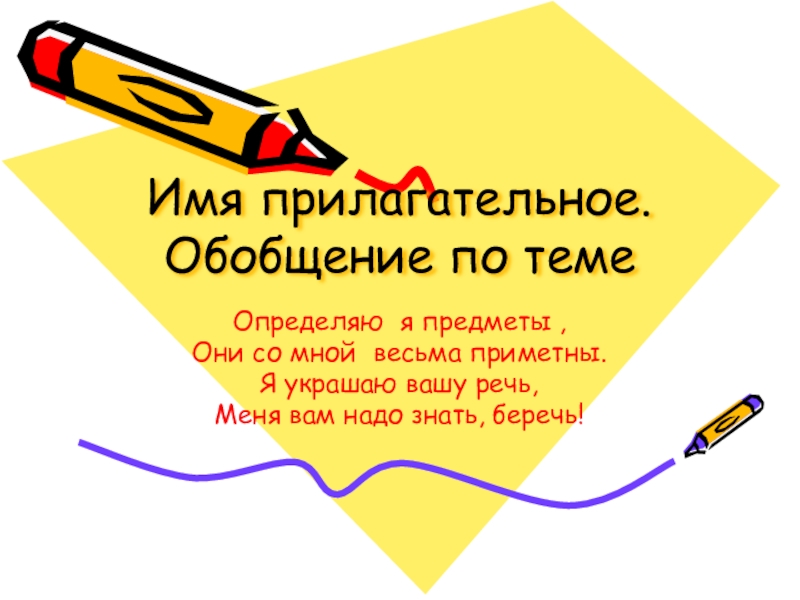 Имя прилагательное. Обобщение по темеОпределяю я предметы ,Они со мной весьма приметны.Я украшаю вашу речь,Меня вам надо знать, беречь!