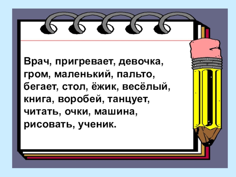 Врач, пригревает, девочка, гром, маленький, пальто, бегает, стол, ёжик, весёлый, книга, воробей, танцует, читать, очки, машина, рисовать, ученик.