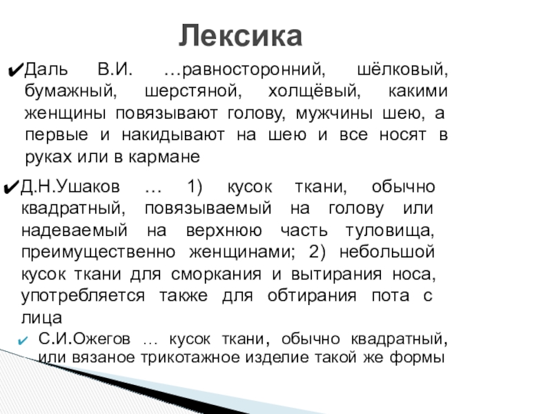 Д.Н.Ушаков … 1) кусок ткани, обычно квадратный, повязываемый на голову или надеваемый на верхнюю часть туловища, преимущественно женщинами; 2) небольшой кусок ткани для сморкания и вытирания носа, употребляется также для обтирания пота с лица