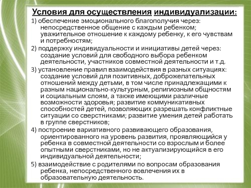 Условия для осуществления индивидуализации:1) обеспечение эмоционального благополучия через: непосредственное общение с каждым ребенком; уважительное отношение к каждому