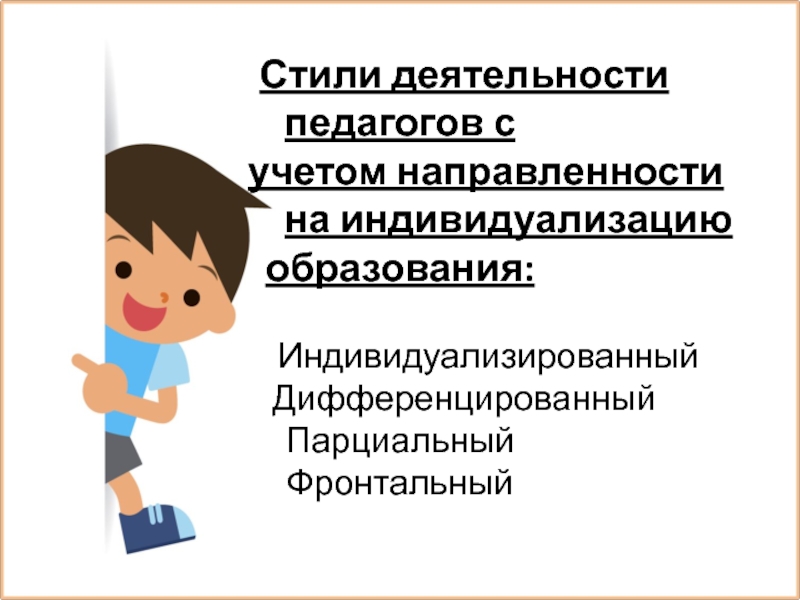 с учетом направленности на индивидуализацию образования: Индивидуализированный Дифференцированный Парциальный  Фронтальный