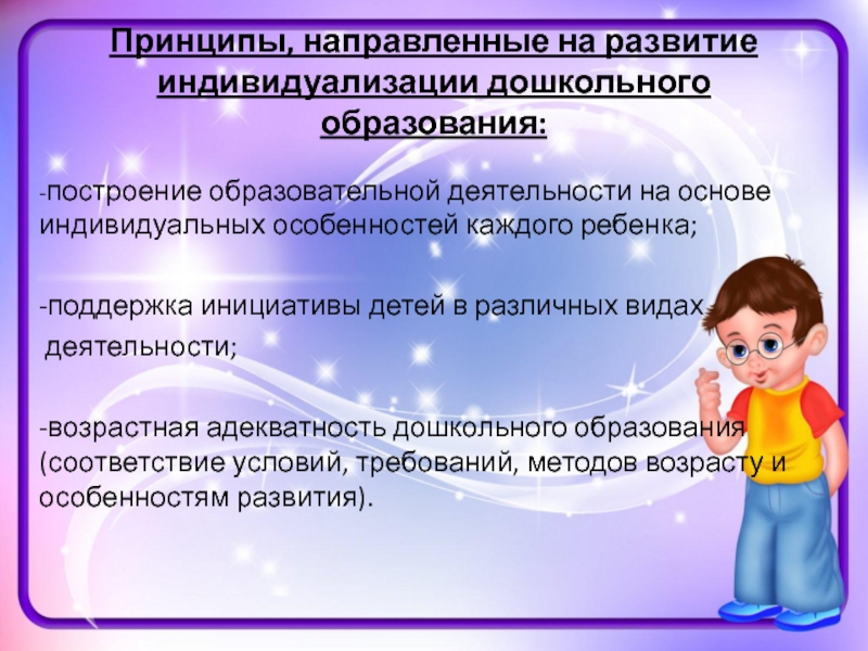 Принципы, направленные на развитие индивидуализации дошкольного образования: -построение образовательной деятельности на основе индивидуальных особенностей каждого ребенка;-поддержка инициативы