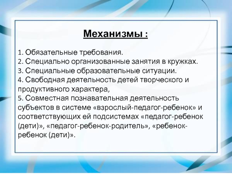 Механизмы : 1. Обязательные требования. 2. Специально организованные занятия в кружках. 3. Специальные образовательные ситуации. 4. Свободная деятельность детей творческого и продуктивного характера, 5. Совместная познавательная деятельность субъектов в системе «взрослый-педагог-ребенок» и соответствующих ей подсистемах «педагог-ребенок (дети)», «педагог-ребенок-родитель», «ребенок-ребенок (дети)».