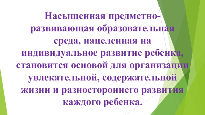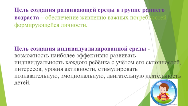 Цель создания индивидуализированной среды - возможность наиболее эффективно развивать индивидуальность каждого ребёнка с учётом его склонностей, интересов, уровня активности, стимулировать познавательную, эмоциональную, двигательную деятельность детей.