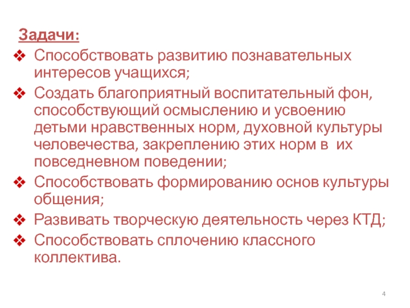 Задачи:Способствовать развитию познавательных интересов учащихся;Создать благоприятный воспитательный фон, способствующий осмыслению и усвоению детьми нравственных норм, духовной культуры