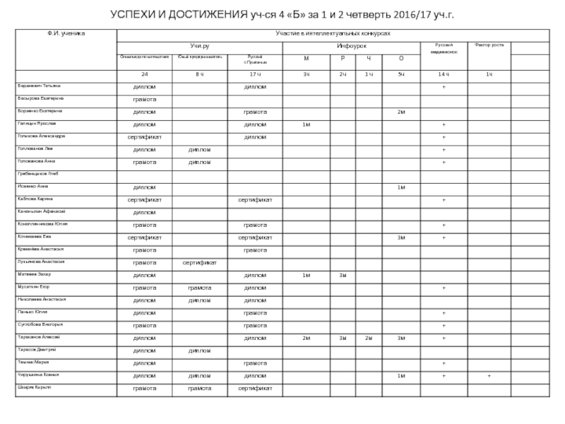 УСПЕХИ И ДОСТИЖЕНИЯ уч-ся 4 «Б» за 1 и 2 четверть 2016/17 уч.г.