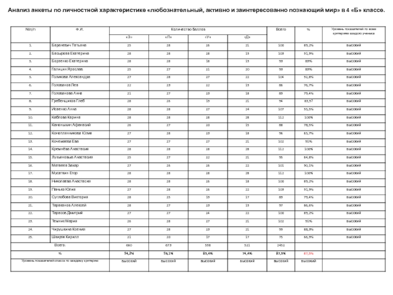 Анализ анкеты по личностной характеристике «любознательный, активно и заинтересованно познающий мир» в 4 «Б» классе.