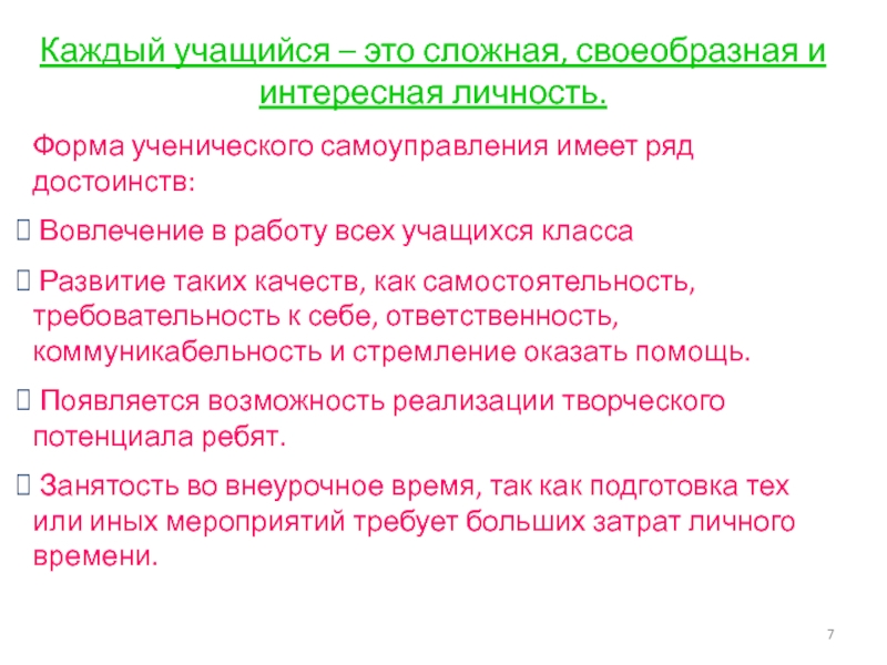 Каждый учащийся – это сложная, своеобразная и интересная личность.Форма ученического самоуправления имеет ряд достоинств: Вовлечение в работу