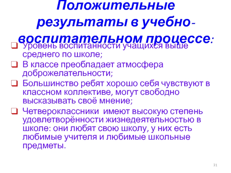 Слайд 31Положительные результаты в учебно-воспитательном процессе: