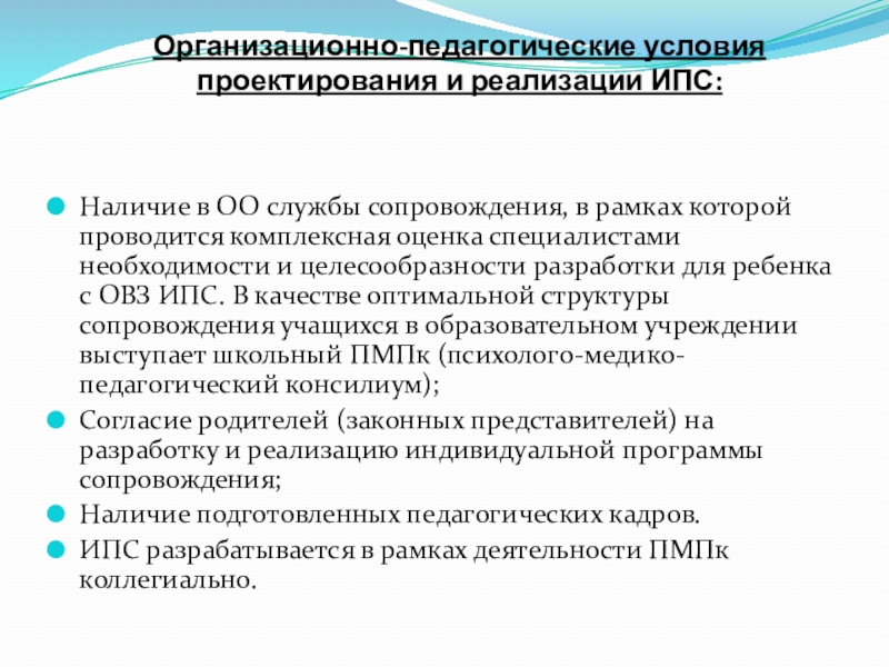 Слайд 4Организационно-педагогические условия проектирования и реализации ИПС: