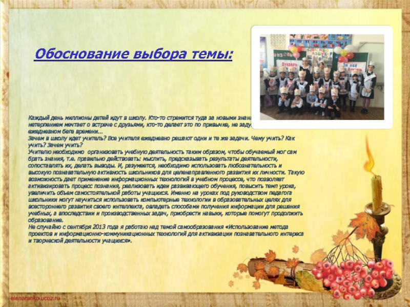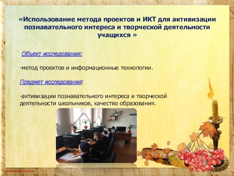 - Повышение качества образования обучающихся на основе активизации учебно – познавательного процесса через использование метода проектов и применения информационных технологий.