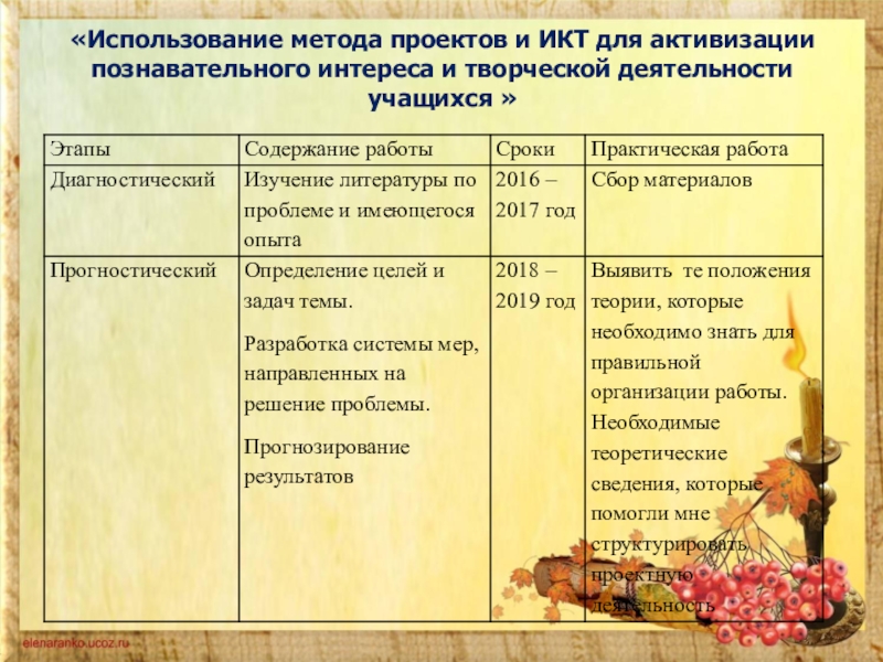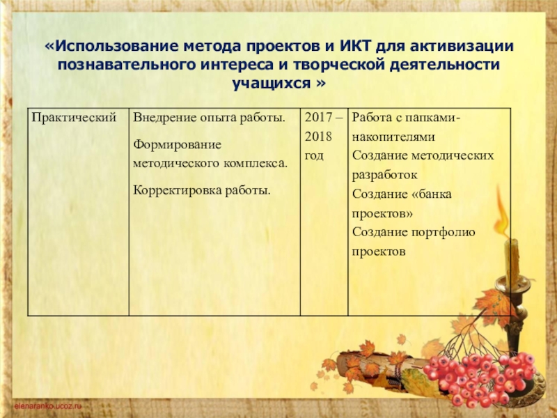 - повысить качество проведения учебных занятий на основе внедрения в образовательный процесс метода проектов и информационно-коммуникационных технологий;