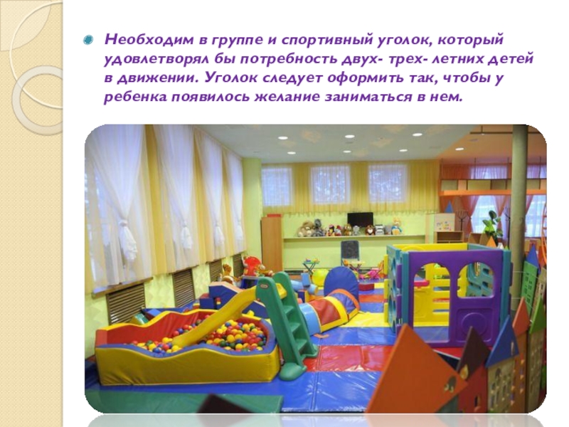 Слайд 9Необходим в группе и спортивный уголок, который удовлетворял бы потребность двух-