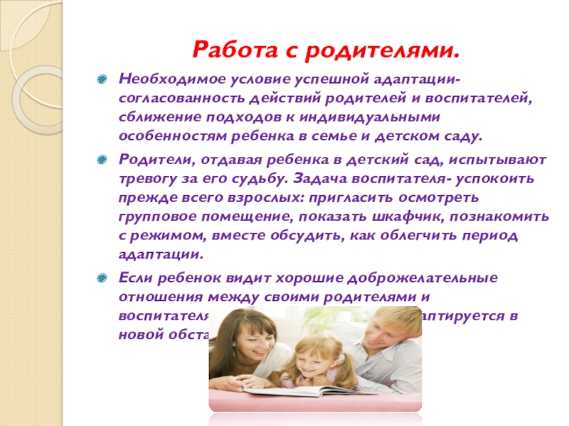 Родители, отдавая ребенка в детский сад, испытывают тревогу за его судьбу. Задача воспитателя- успокоить прежде всего взрослых: пригласить осмотреть групповое помещение, показать шкафчик, познакомить с режимом, вместе обсудить, как облегчить период адаптации.
