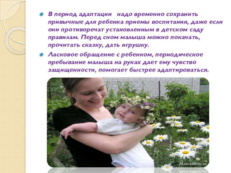 Слайд 12В период адаптации надо временно сохранить привычные для ребенка приемы