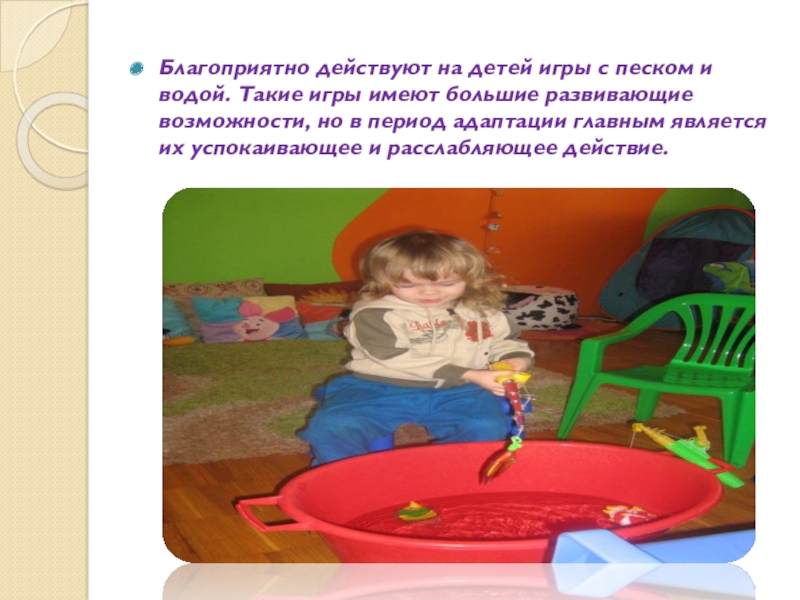 Слайд 10Благоприятно действуют на детей игры с песком и водой. Такие игры