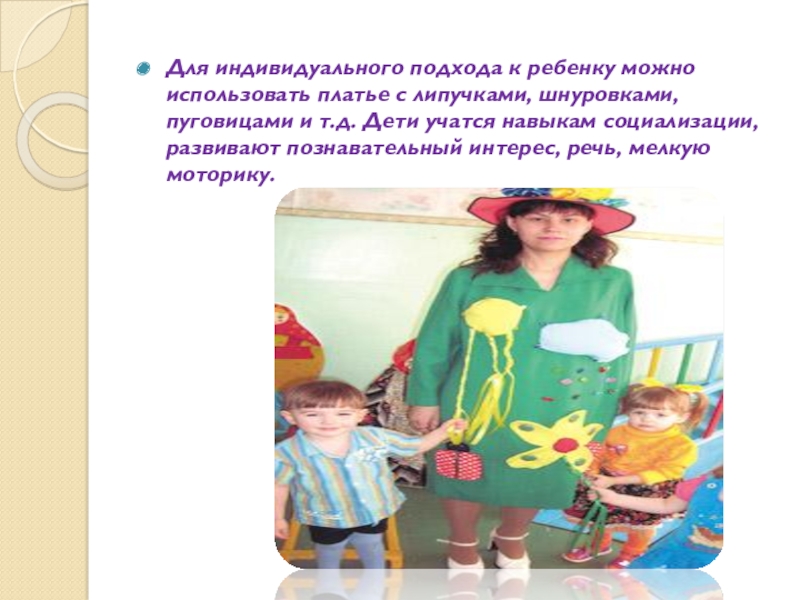 Слайд 11Для индивидуального подхода к ребенку можно использовать платье с липучками, шнуровками,