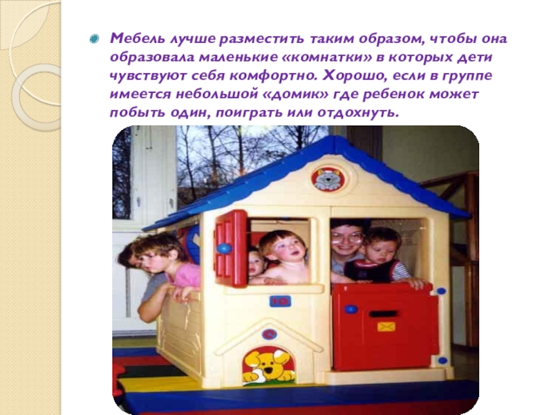 которых дети чувствуют себя комфортно. Хорошо, если в группе имеется небольшой «домик» где ребенок может побыть один, поиграть или отдохнуть.