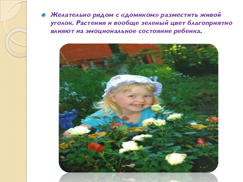 Слайд 8Желательно рядом с «домиком» разместить живой уголок. Растения и вообще зеленый