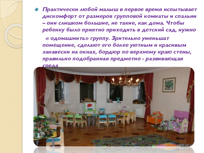 Слайд 6Практически любой малыш в первое время испытывает дискомфорт от размеров групповой